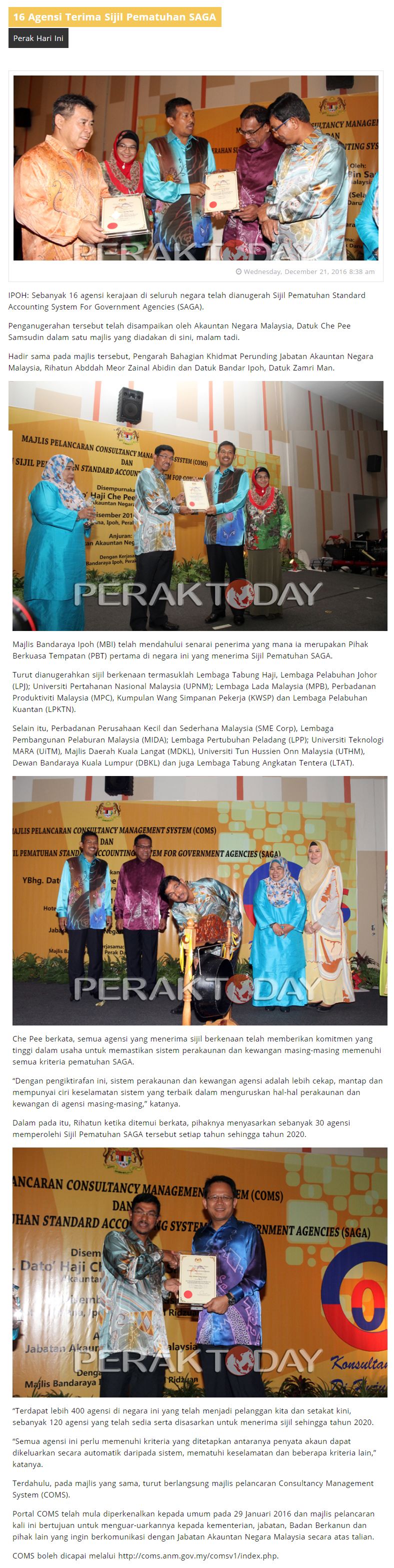 16 Agensi Terima Sijil Pematuhan SAGA (Perak Today, 21 Disember 2016)