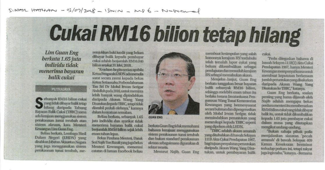 Cukai RM16 Billion Tetap Hilang (Sinar Harian, 3 September 2018)